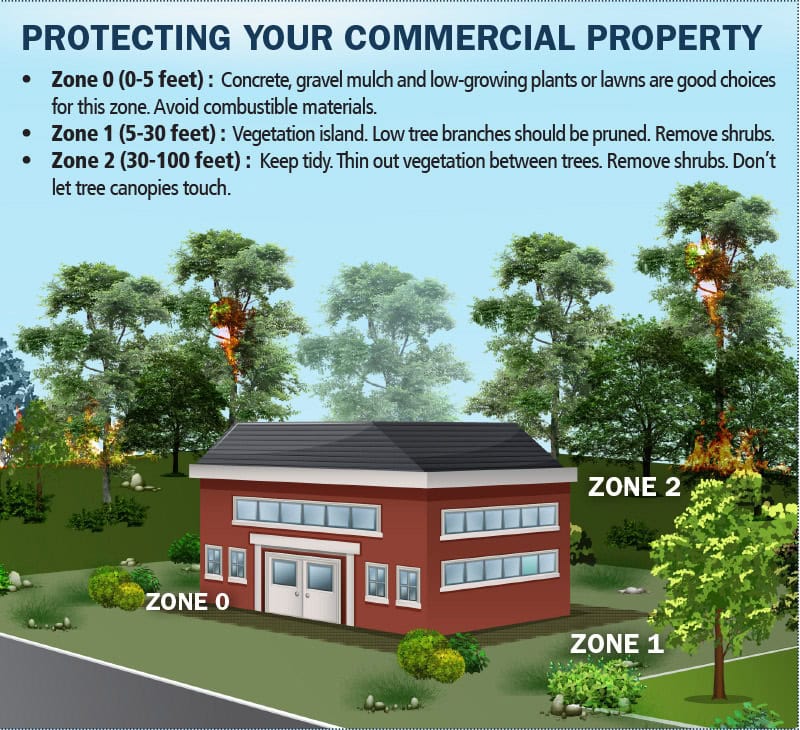 - Defensible space: Creating defensible space around the perimeter of their building, usually all the way to the property line. You can find a thorough description of how to create a defensible space here.
